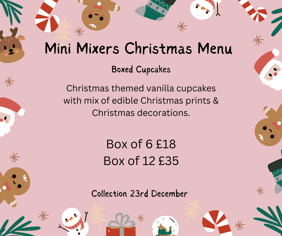 Christmas themed vanilla cupcakes with a mix of edible Christmas prints and Christmas decorations.